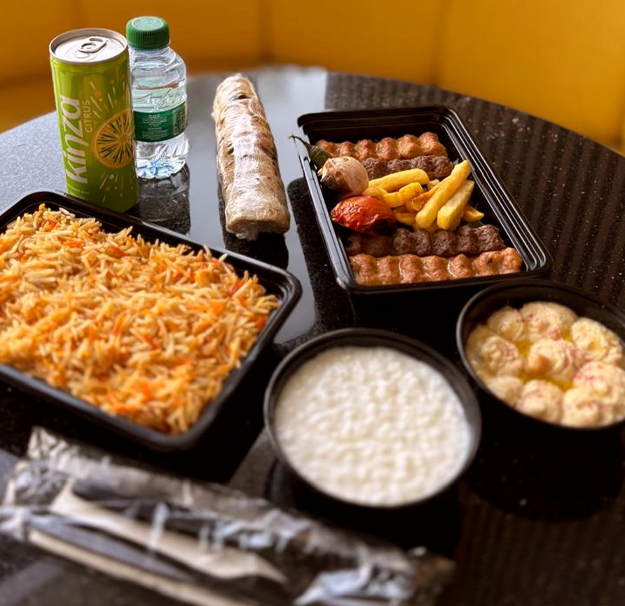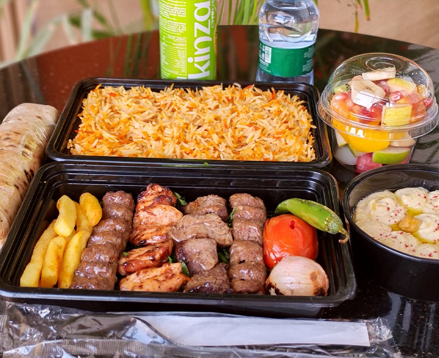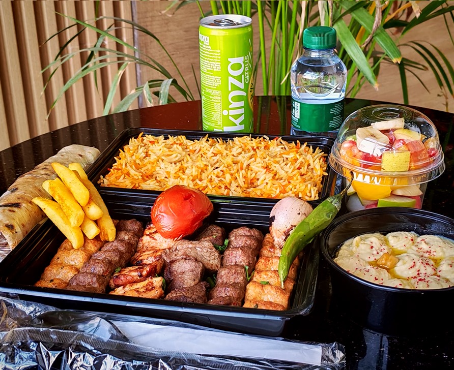 مشاوى 4 سيخ كباب لحم + كباب دجاج يقدم مع الارز والبطاطس + سلطه الحمص