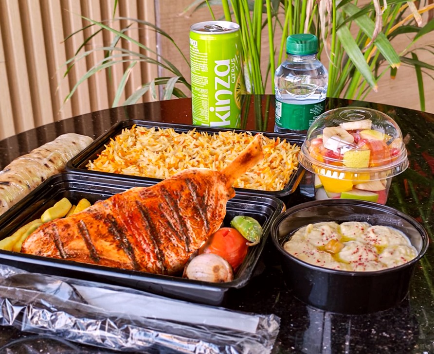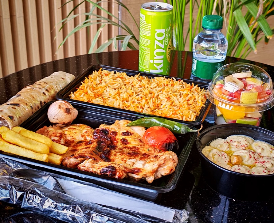 نصف دجاج تقدم مع الارز والبطاطس + سلطه الحمص